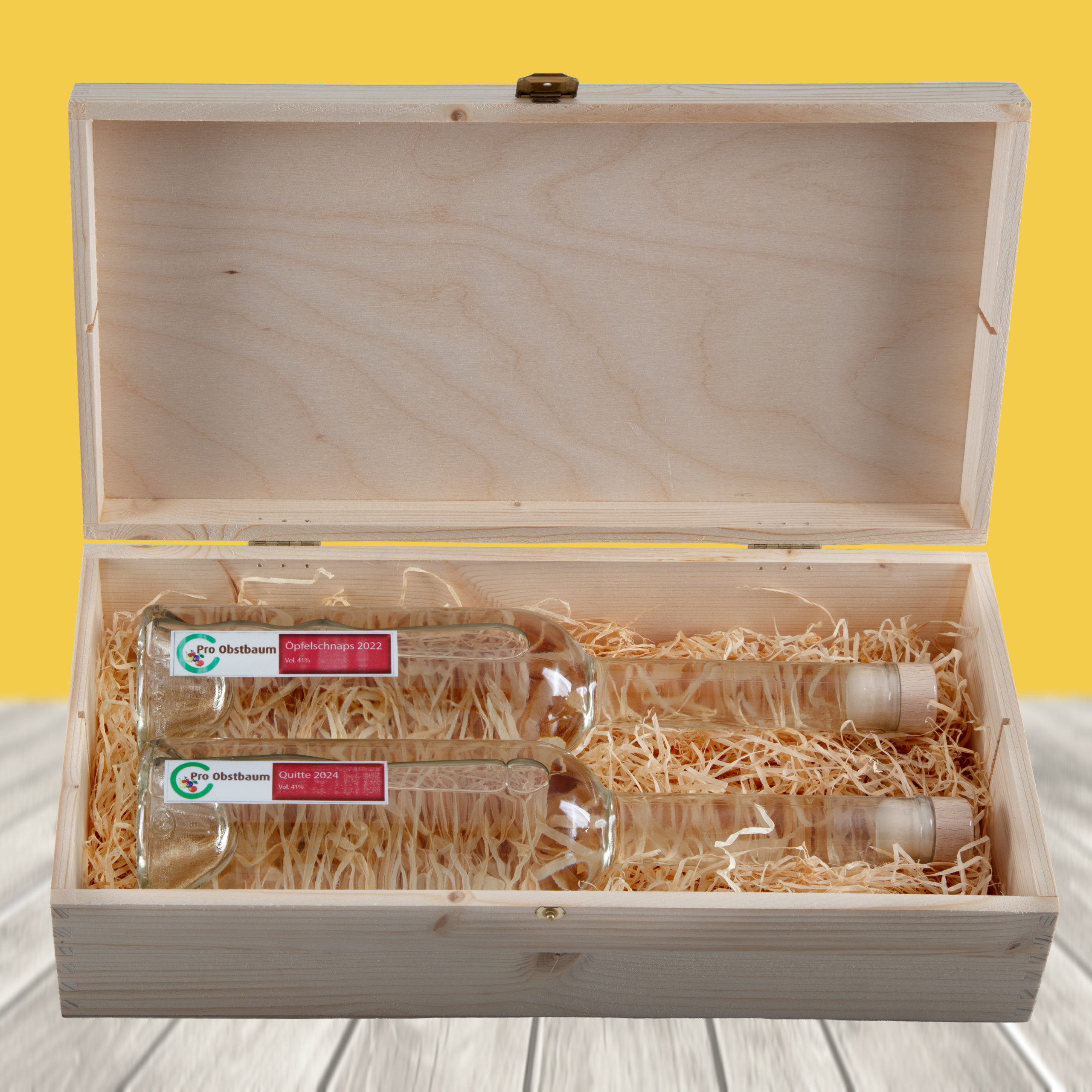 Inhalt: Schnaps Combo aus Balzers Apfel & Quitte, in Geschenkkiste mit ProObstbaum Logo, Bio